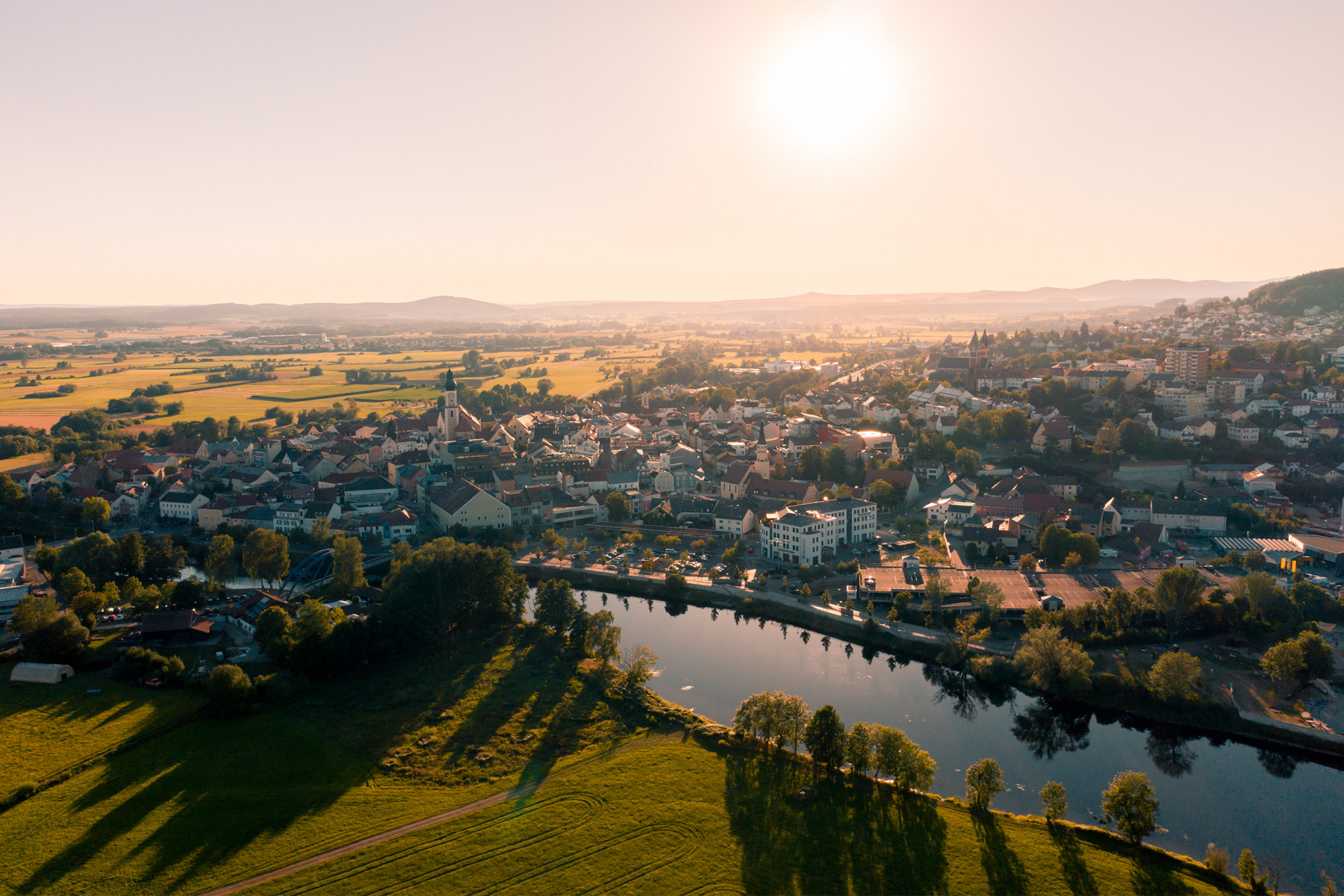 Aus der Luftperspektive erkennt man erst wie schön sich der Regen an die Stadt Cham…